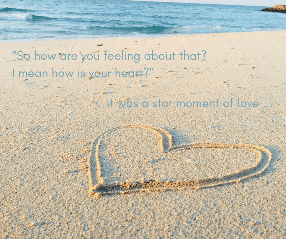 The love motivating the question went straight into my heart. I welled up with emotion at the kindness and care showed to me. I allowed myself to feel all that. It swelled in my heart and then spread out from my heart through my body leaving me feeling love and loved in that moment. It was a star moment. A precious moment teaching me the value of not only asking ‘how are you?’ but asking ‘how are you feeling?’ and really caring about that with awareness of the other person’s heart.